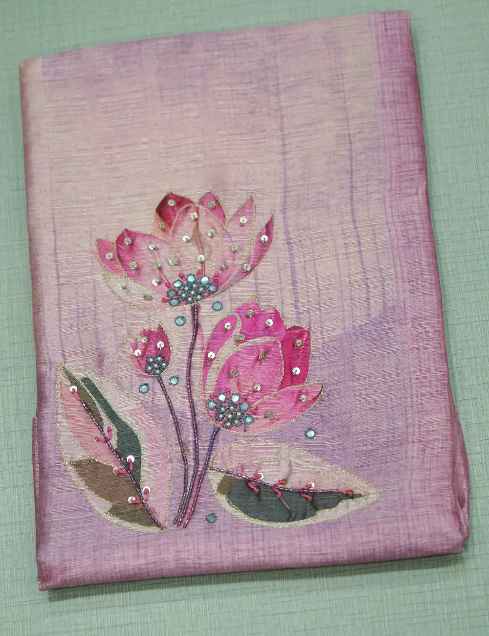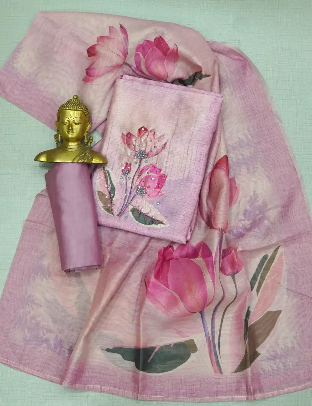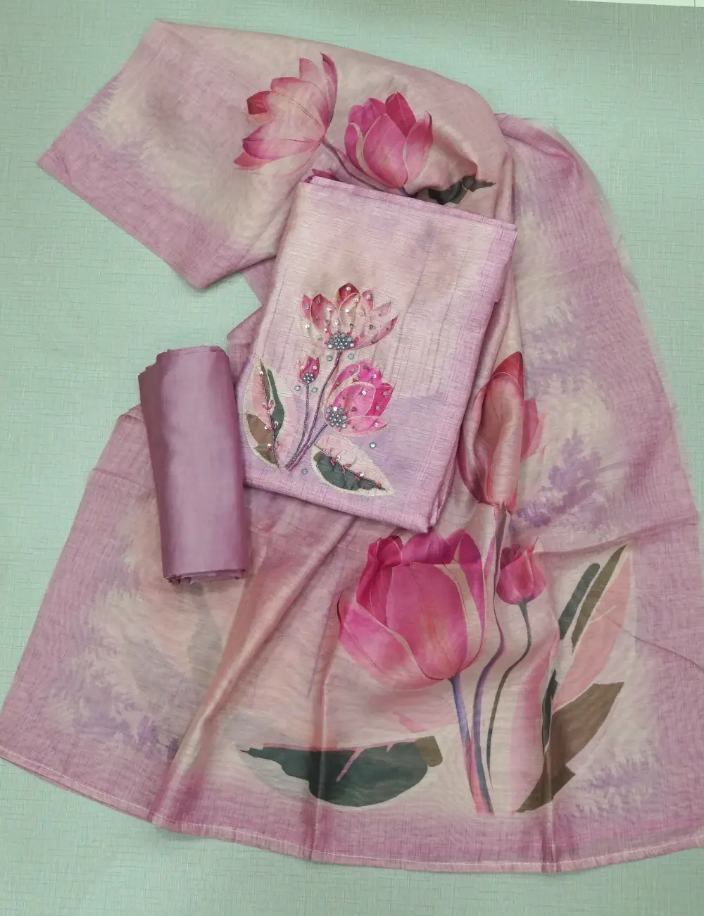 Pastel Purple Colour Soft Tussar Silk Chudi Material – Floral Print and Sequins Work with Bottom and Printed Dupatta.