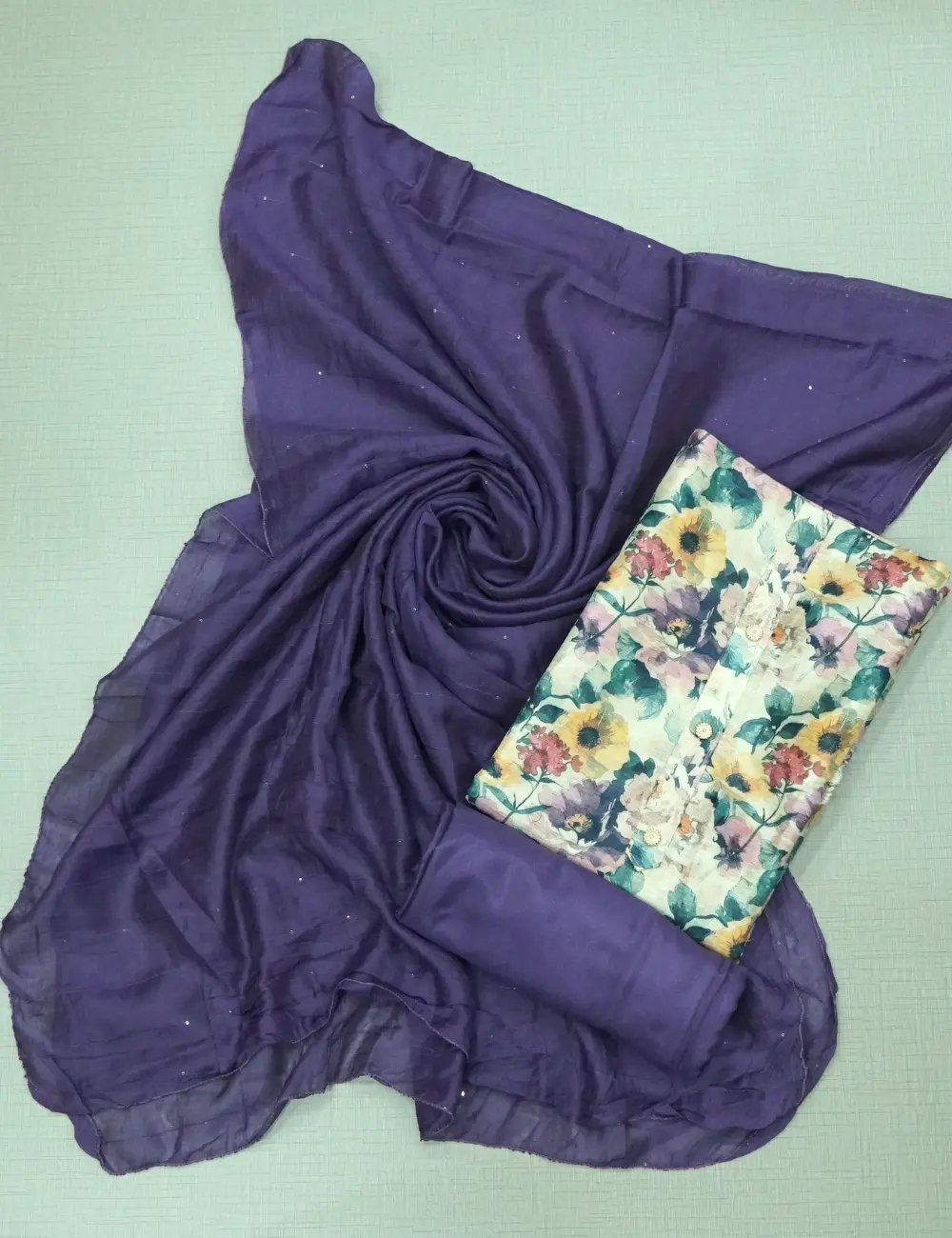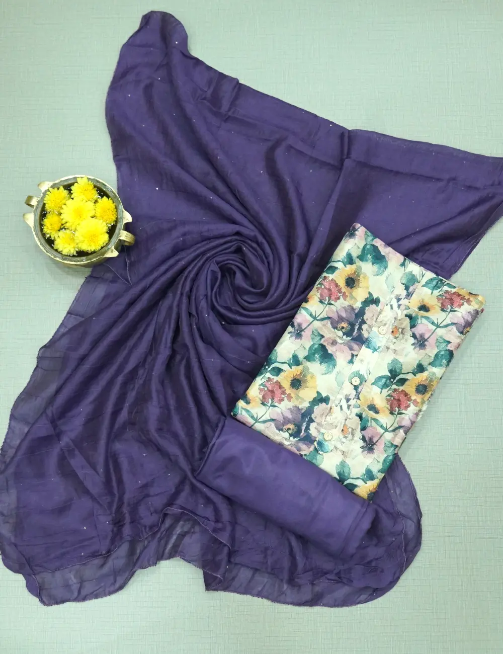 Purple Colour Floral Printed Linen Cotton Chudi Material with Contrast Bottom and Dupatta.